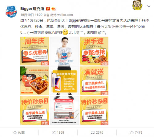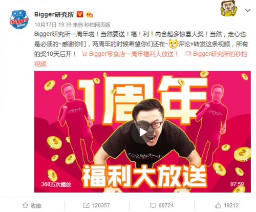 2017年10月20日,以“测评种草”为主要内容的短视频生产者Bigger研究所迎来首个周年庆。从发布活动视频到店庆活动启动的两天时间内,活动视频转发超11万人次,评论突破5万条,破历史同期最高数据。店庆当日,活动开始后1分钟的成交额达20万元,1小时内成交额突破30万元。这些数据无不彰显Bigger研究所成立一年来在种草测评领域累积的巨大能量。